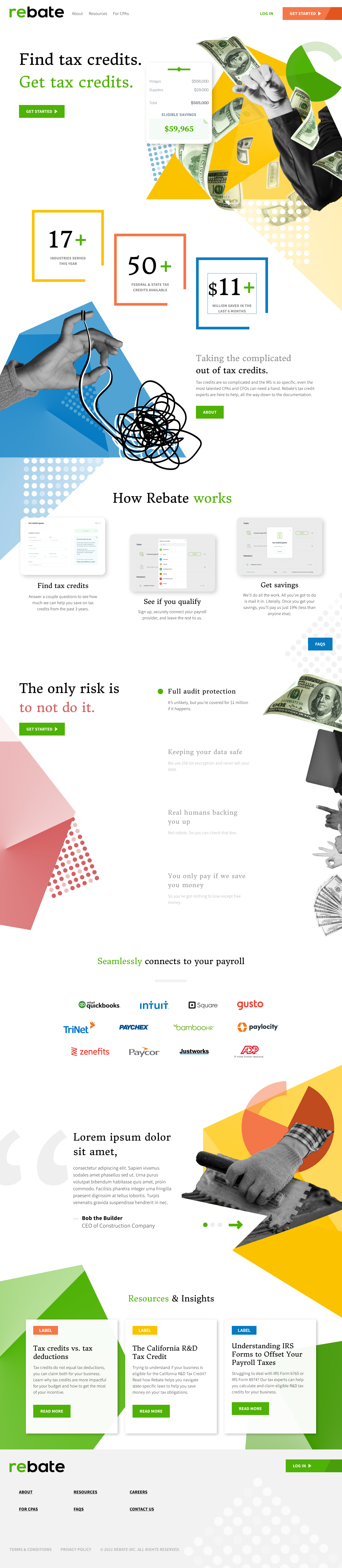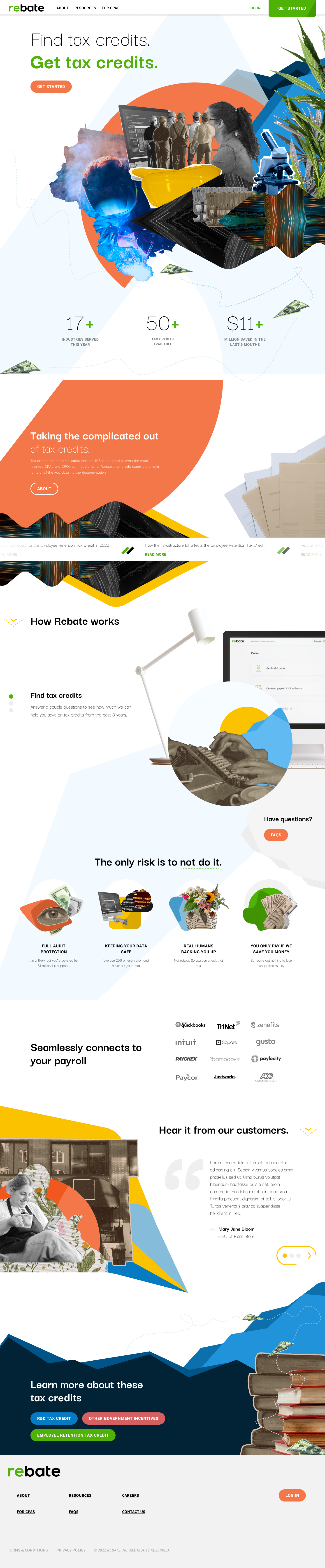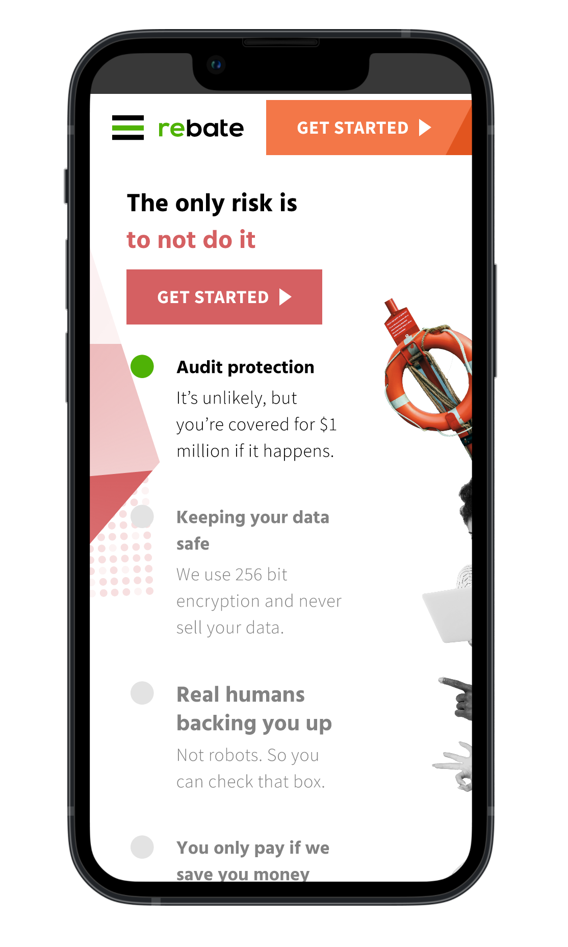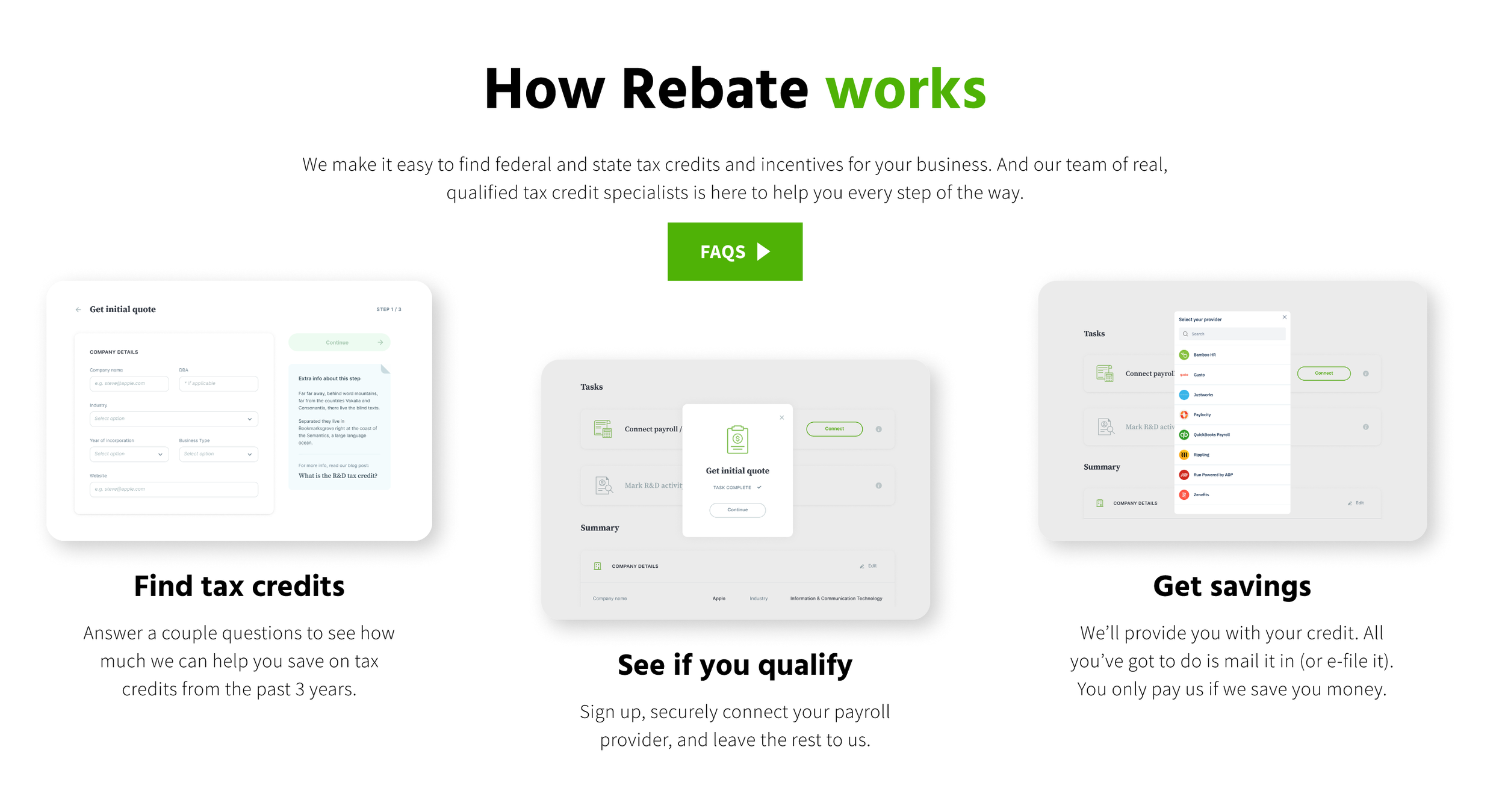 Rebate helps businesses find and claim federal and state tax credits. Their services include estimated savings to claim, all tax credit documentation prepared, filing instructions and manual, audit protection for up to $1 million, and a guarantee on money your business wouldn’t have otherwise had.